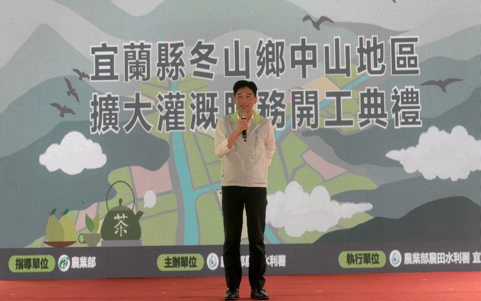 農業部農田水利署(下稱農水署)蔡昇甫署長於今(26)日蒞臨宜蘭縣冬山鄉中山地區擴大灌溉服務工程說明暨開工典禮。本區域主要栽種茶葉和文旦,然而,因既有設施老舊損壞,亟待改善,導致當地農業發展受限,宜蘭管理處已完成當地灌溉用水規劃、工程設計與發包作業,期有效解決當地灌溉用水問題。