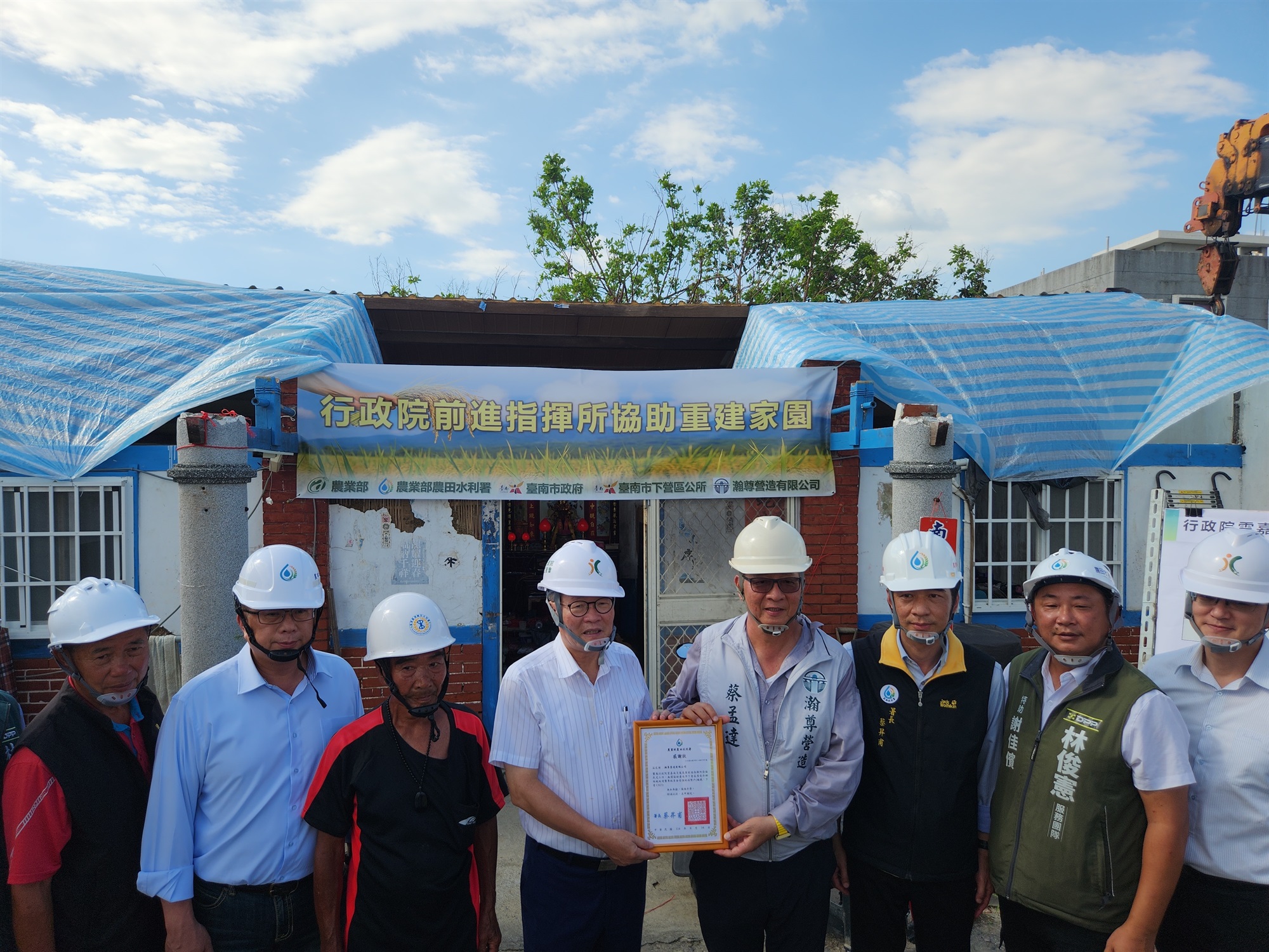 前進指揮所成立後,農水署蔡昇甫署長立即率員與下營區公所組成專業團隊勘查受損房舍,當勘查到下營區紅甲里顏伯伯的家時,看到屋頂遭掀翻,居住困難,令人心疼,再進一步得知顏伯伯為中低收入戶,短期內無力支付修繕費用,只能暫時用帆布蓋在破損房舍上,勉強生活,更加令人心疼。農水署與瀚尊營造股份有限公司(下稱瀚尊營造)討論如何修繕顏伯伯的房舍時,該公司得知顏伯伯的處境時,立即主動表示願意善用該公司的工程專業,免費幫顏伯伯重新搭好可遮風擋雨的堅固屋頂。