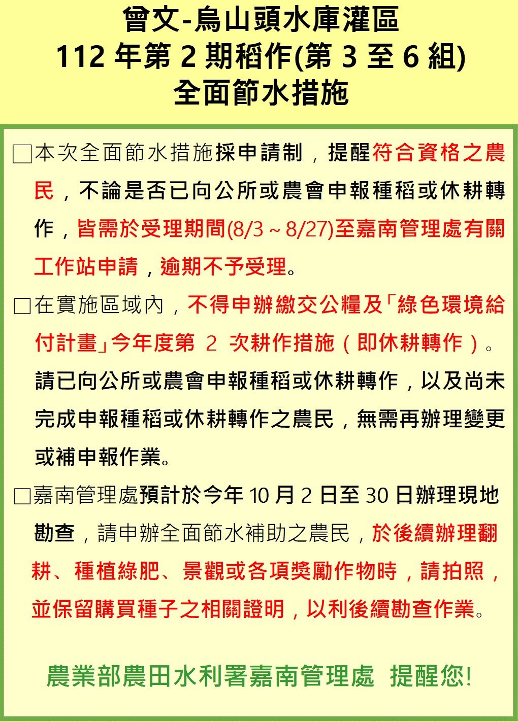 因應水情嚴峻 曾文-烏山頭水庫灌區112年第2期稻作第3至6組實施全面節水措施